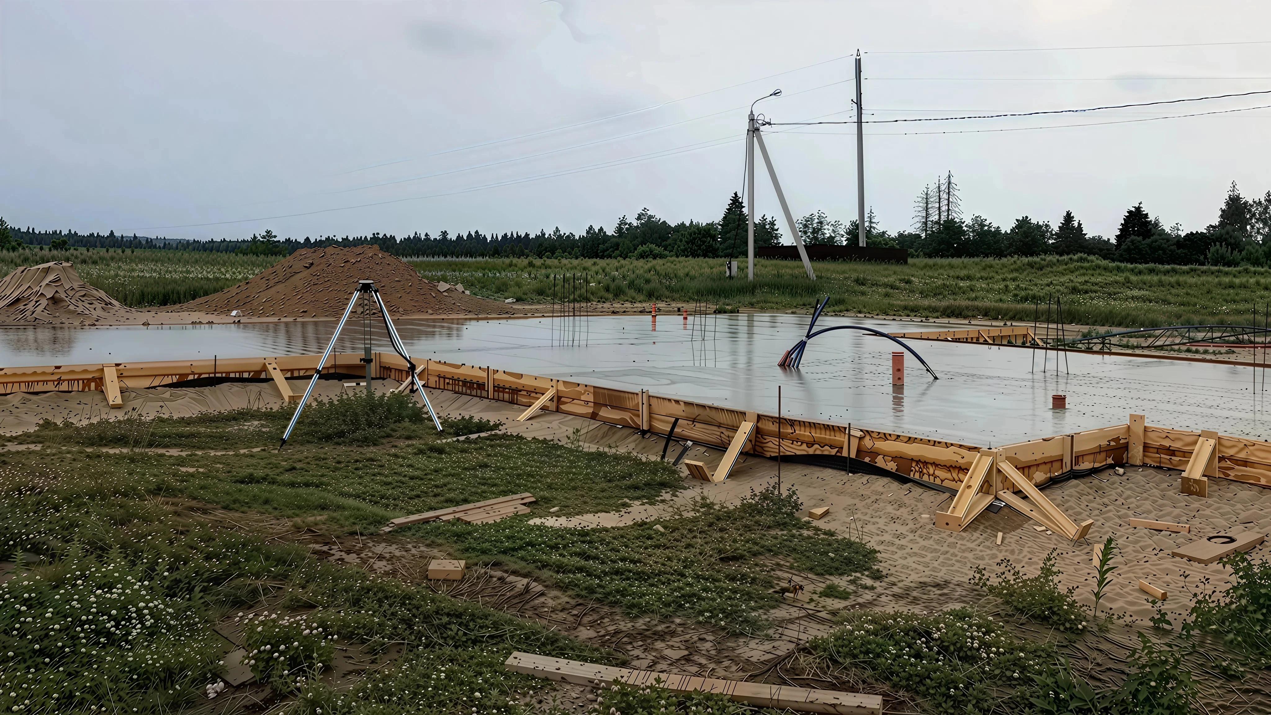 Мы строим основания под частные дома, коттеджи и промышленные здания. В галерее собрали реальные объекты: от подготовки участка и опалубки до заливки плиты и гидроизоляции.
